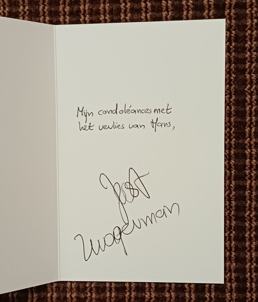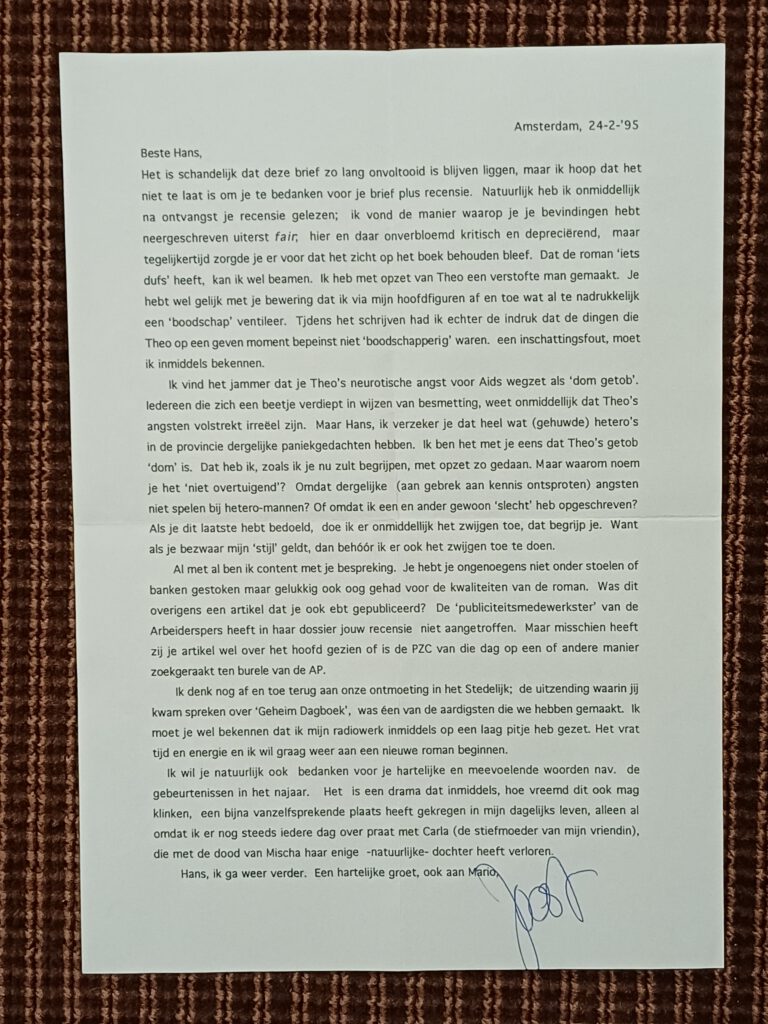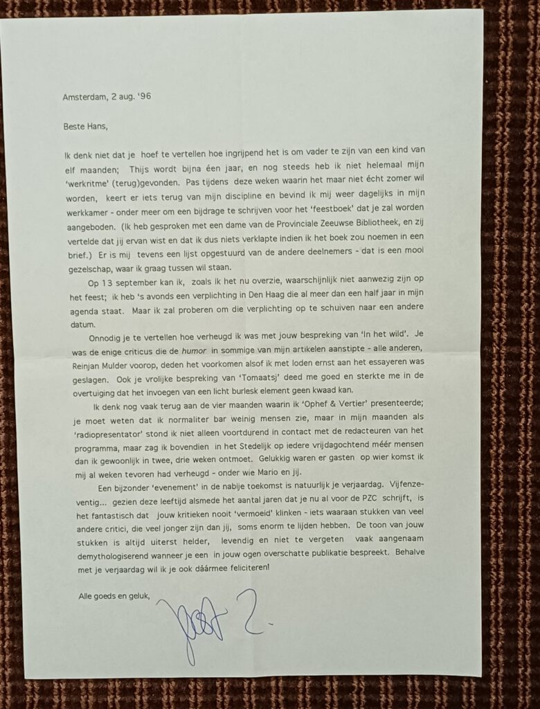 Op 11 november 1994 sprak Joost Zwagerman in zijn radioprogramma Ophef en vertier met Hans Warren. Het gesprek ging ‘matig’, meldt deze in zijn dagboek, ‘zijn vragen waren niet pittig en mijn antwoorden niet briljant’. Joost Zwagerman vond de uitzending daarentegen, zo schrijft hij in een brief van 24 februari 1995, ‘éen van de aardigsten die we hebben gemaakt’. De ontmoeting komt niet voor in de spraakmakende biografie Zwaag. De zeven levens van Joost Zwagerman. Hans Warren wordt in dat boek een paar maal terloops vermeld, zoals Joost Zwagerman enkele keren zijdelings opduikt in mijn Opperhuidmens. De biografie van Hans Warren. Misschien niet helemaal terecht gezien de beschouwingen die Zwagerman aan Warren wijdde: in 1993 het voorwoord van Geheim dagboek 1939-1940 en in 1996 een stuk ‘Bidden zonder god’ in het vriendenalbum Hans Warren 75. De geringe aandacht is wél gerechtvaardigd wanneer je kijkt naar wat er tevoorschijn komt uit de Zwagerman-envelop in de Hans Warren-collectie. Welgeteld twee geboortekaartjes, twee brieven en een plichtmatige condoleance. De belangrijkste ontmoeting van de twee auteurs was die vanwege het radio-interview. Ook in zijn brief van 2 augustus 1996 blikt Joost Zwagerman erop terug: er waren ‘gasten op wier komst ik mij al weken tevoren had verheugd – onder wie Mario en jij’. In de brief gaat het verder over zijn bijdrage aan het ‘feestboek’, Hans Warren 75. In het artikel zegt Zwagerman over Ophef en vertier: ‘Het was ambachtelijk gezien […] misschien niet mijn beste radio-interview dat ik maakte, want de gretige lezer zat de nuchtere interviewer enigszins in de weg’. Juist, Joost. Gelukkig spreekt in Zwagermans stukken over Warren die gretige lezer.